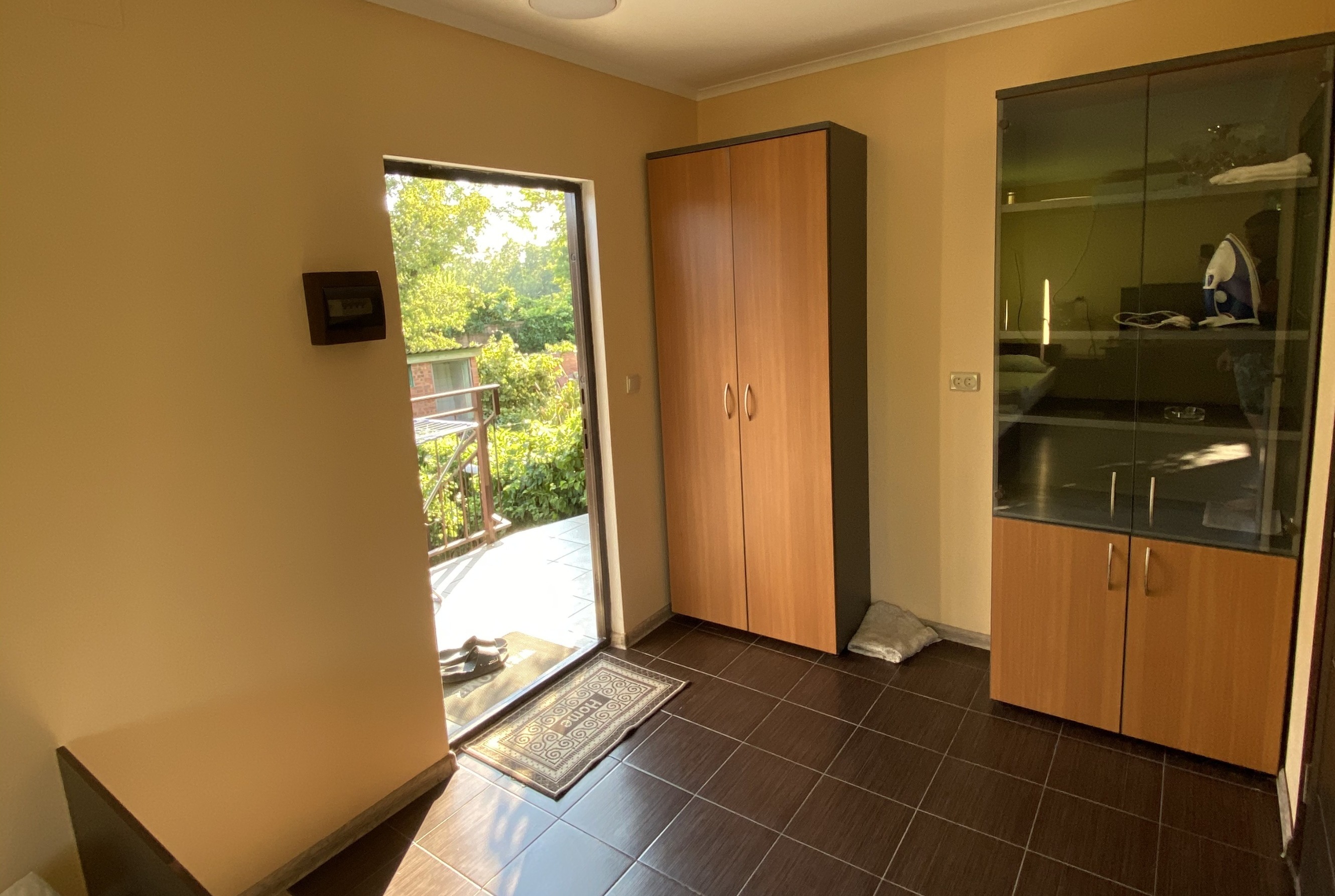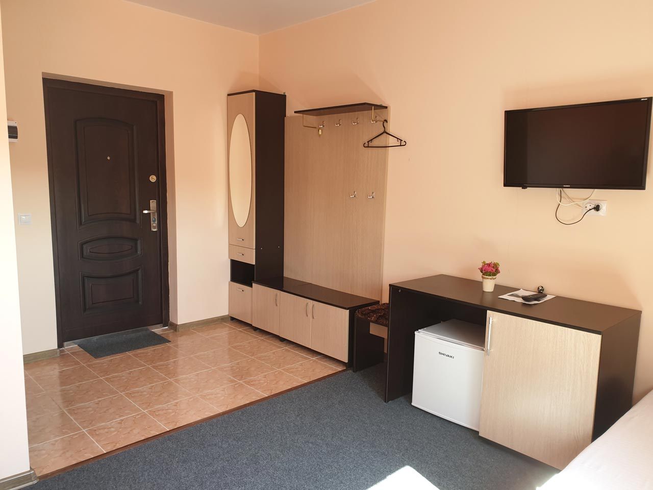 - Мебель: вешалка, зеркало, кровать двуспальная, кровать односпальная, прикроватные тумбочки, стол, стул, шкаф